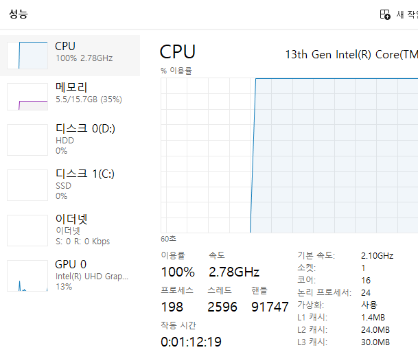 PC 의 스트레스 테스트를 진행 하고 있는 상황에서 의 성능은 다음과 같습니다.