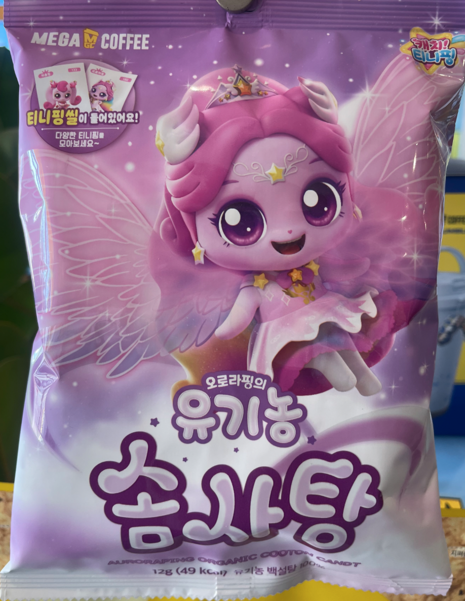 메가커피 에서 티니핑 관련 상품들이 여러가지 출시 되었는대 이번에 오로라핑 솜사탕 이 신규로 출시 되었습니다.