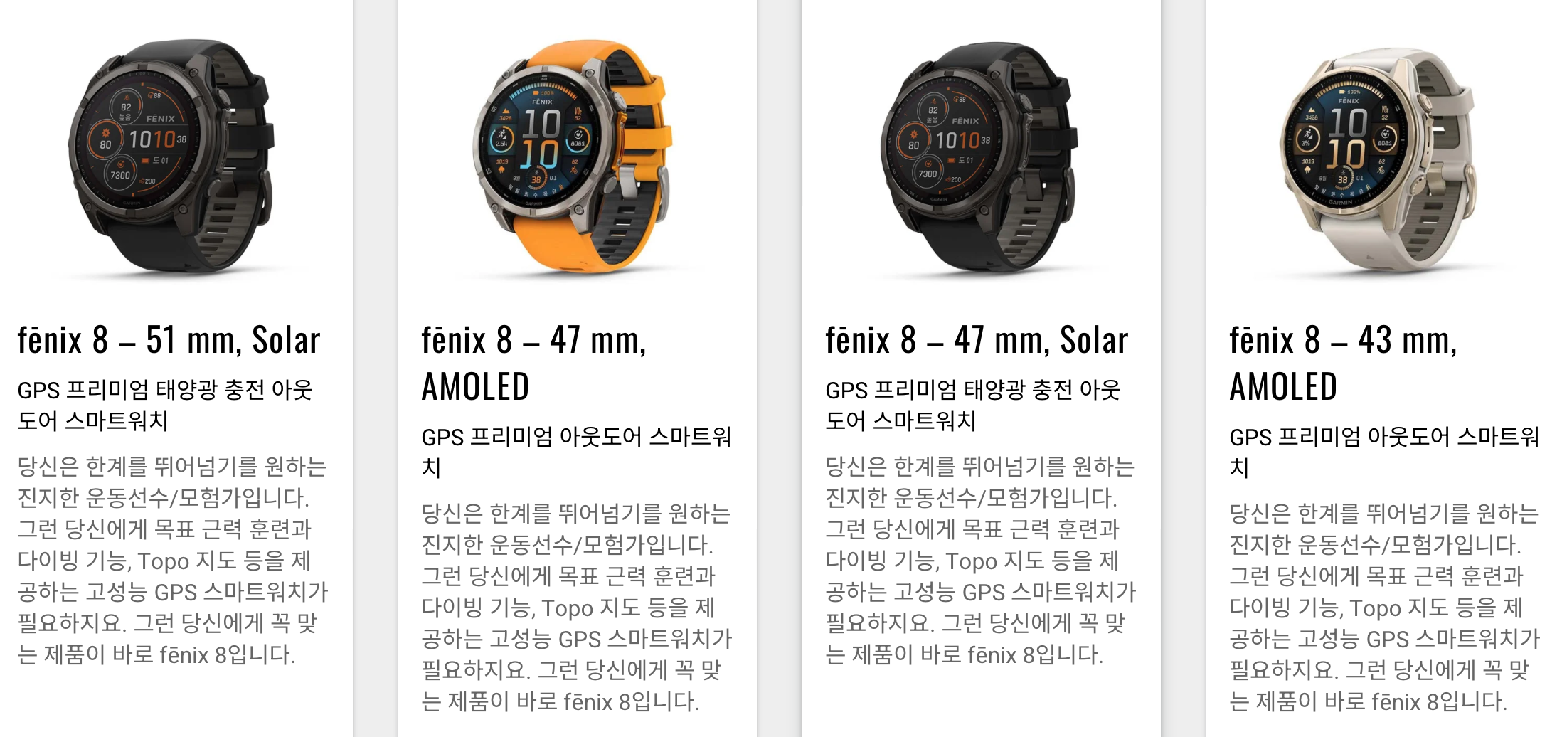- 가민 피닉스 7 프로: 피닉스 8의 전작으로, 여전히 강력한 기능을 제공하며 가격은 약 759,000원으로 더 저렴합니다.