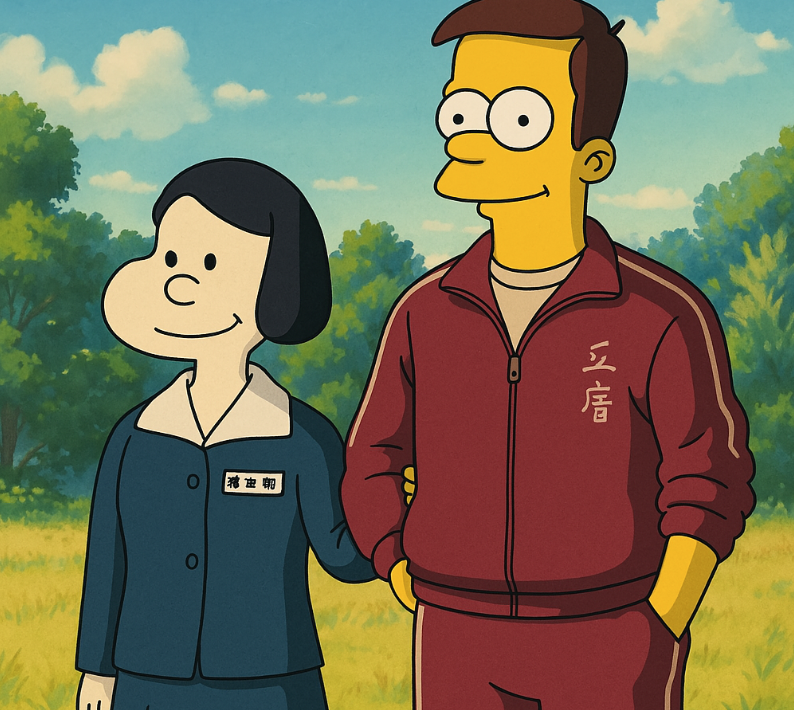 "여자는 스누피 스타일로 남자는 심슨 스타일 배경은 지브리 스타일로 변경 가능할까?"