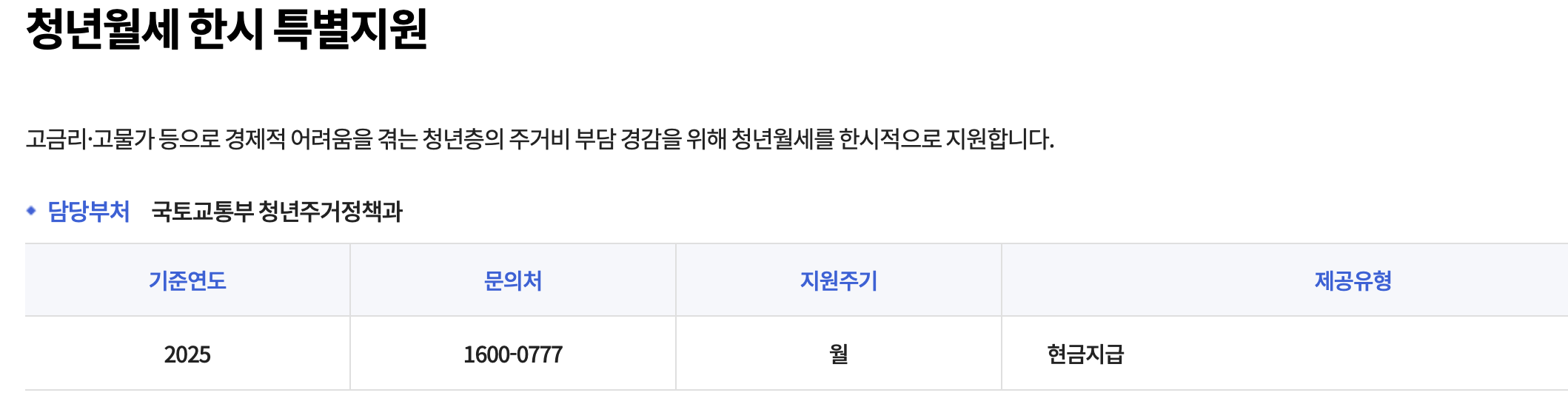- 정식 명칭: 청년 월세 한시 특별지원 사업