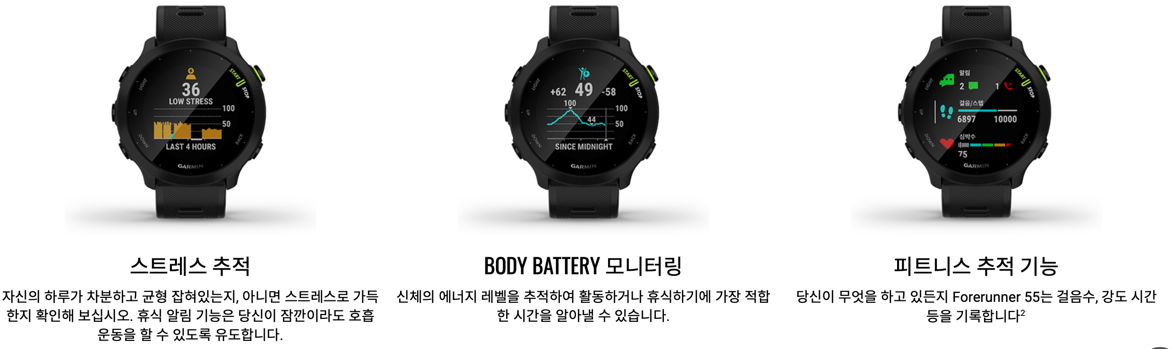 가민 포러너 55 는 일상에서의 심박수를 지속적으로 추적합니다. 운동뿐만 아니라 일상적인 활동에서도 심박수 데이터를 수집하여 스트레스 수준과 건강 상태를 체크할 수 있습니다.