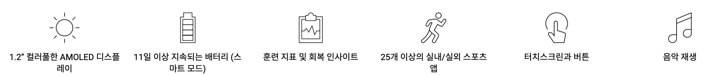 - 뮤직 기능 (뮤직 모델 전용): Wi-Fi로 음악 동기화 후, 블루투스 이어폰으로 재생 가능