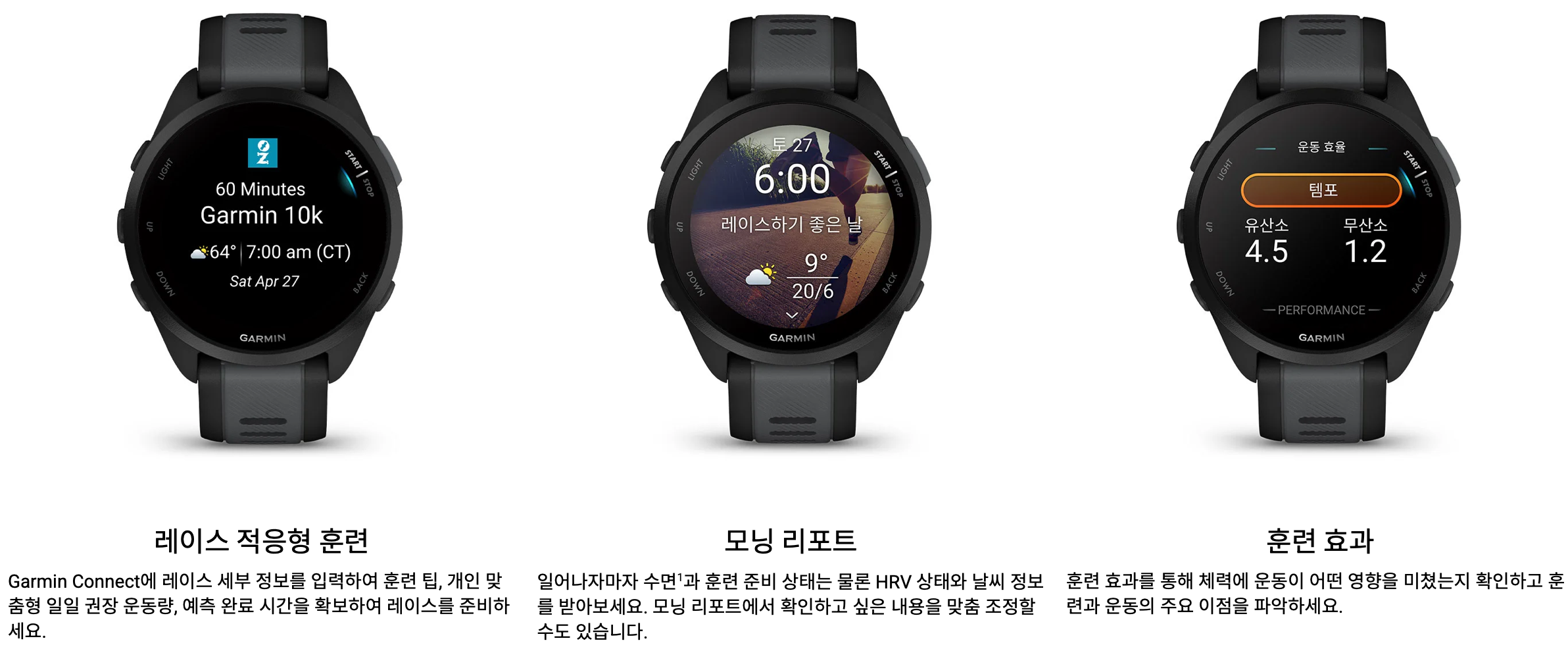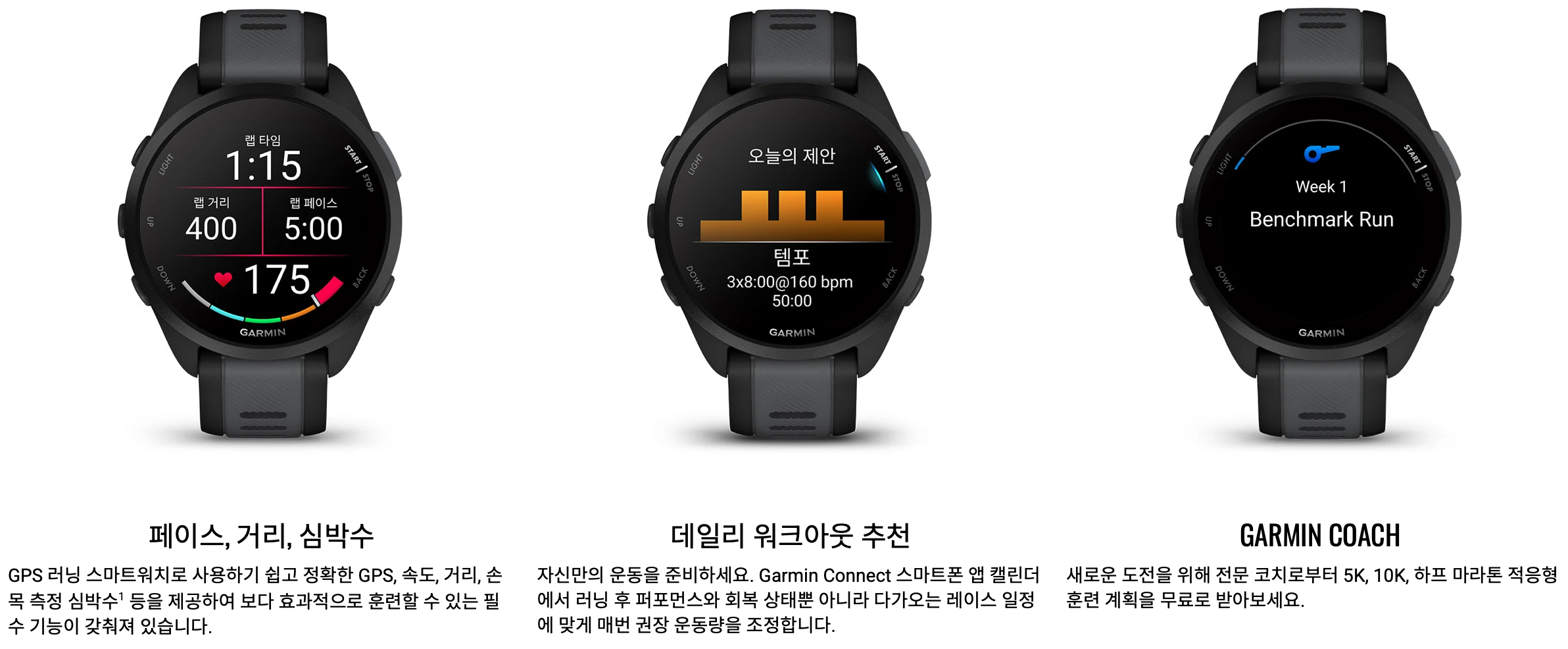 - Garmin Coach: 개인별 훈련 플랜 제공 (5K/10K/하프 마라톤 지원)