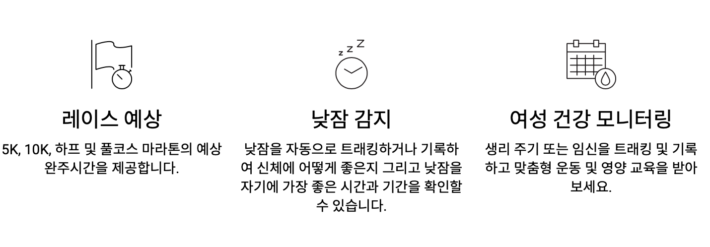 - 레이스 훈련 예측: 완주 예상 시간, 회복 시간, 운동 강도 안내