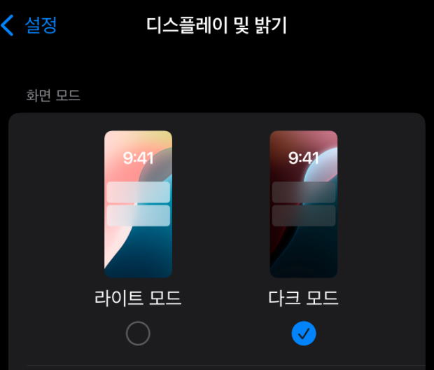 - 설정 > 디스플레이 및 밝기 > 외형 > 다크