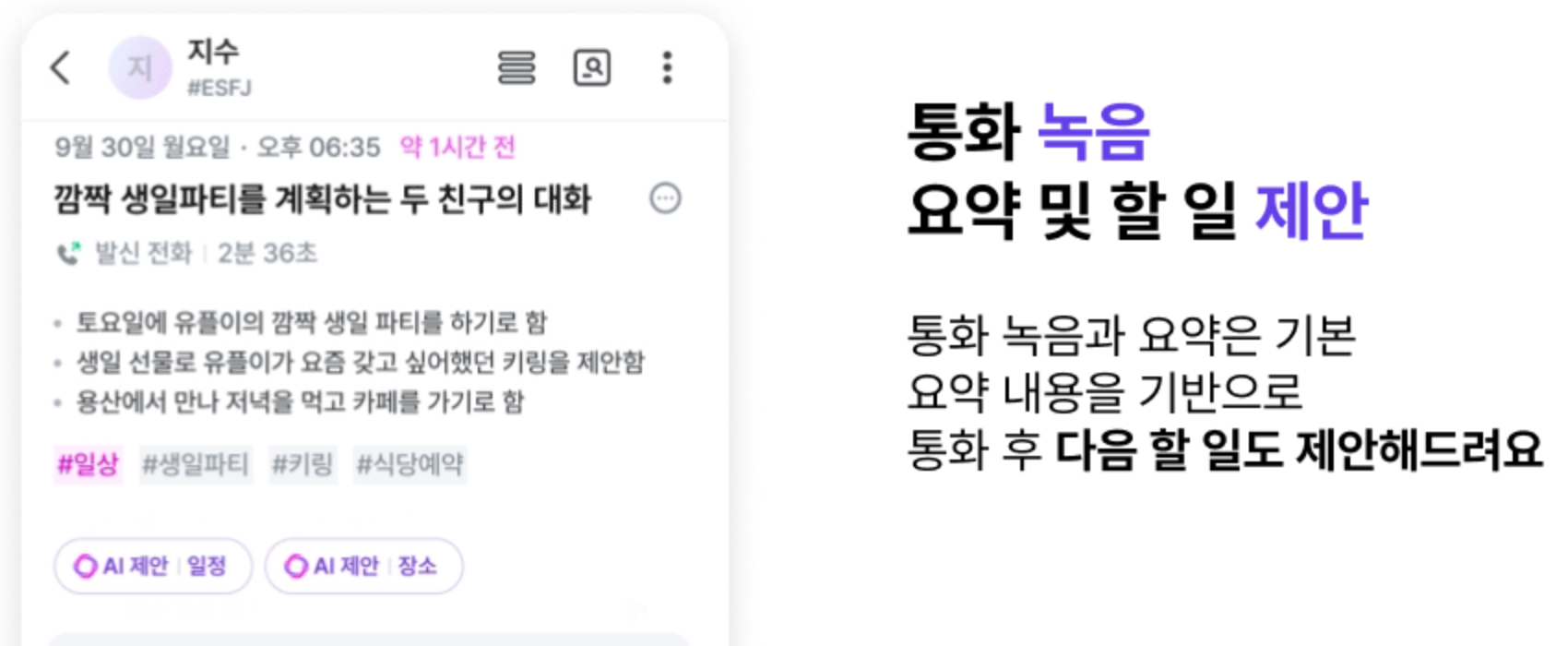 | 통화 녹음 및 AI 요약 | 통화 내용을 자동으로 녹음하고 텍스트로 변환, 요약 제공 |