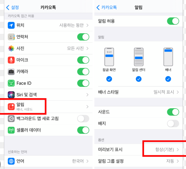 설정 > 알림 > 미리보기 표시 > 잠금 시 안 함 - 효과: