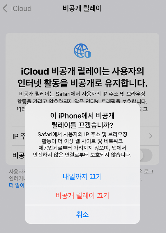 설정 > Safari > IP 주소 숨기기 > 추적기로부터 - 효과: