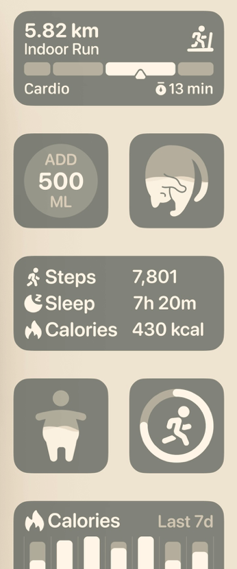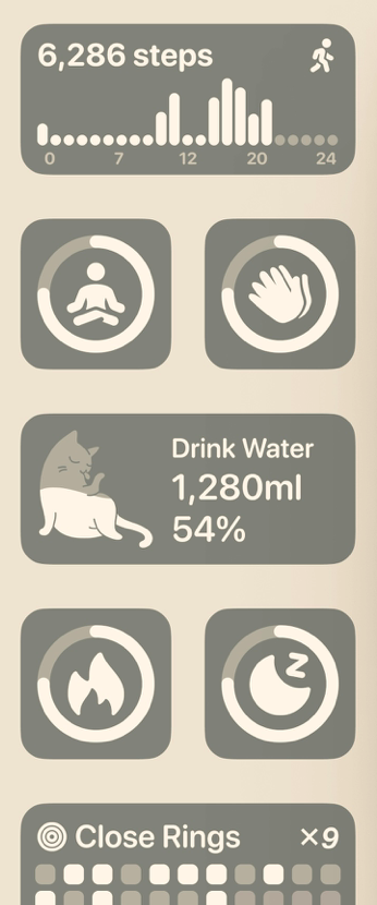 | 운동/건강 | 운동 링, 물 섭취, 걸음 수 |