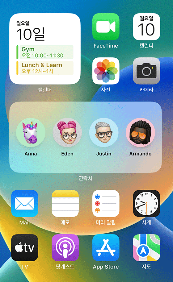 | 앱 위젯 확장 | 건강, 음악, 리마인더 등 애플 기본 앱 외에도 다양한 서드파티 앱 위젯 지원 |