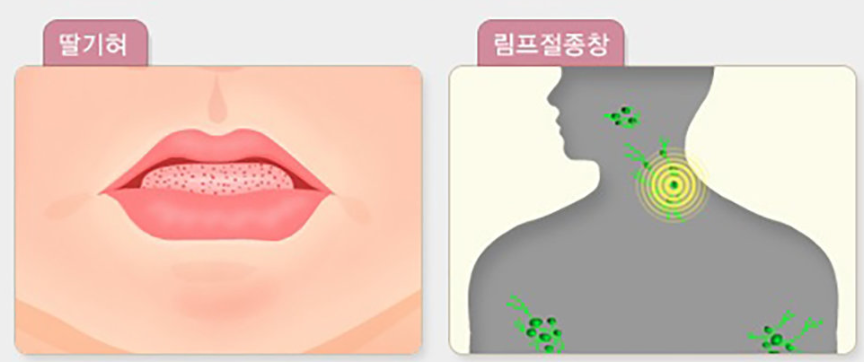 - 딸기 혀 (혀가 빨갛고 돌기처럼 부음)
