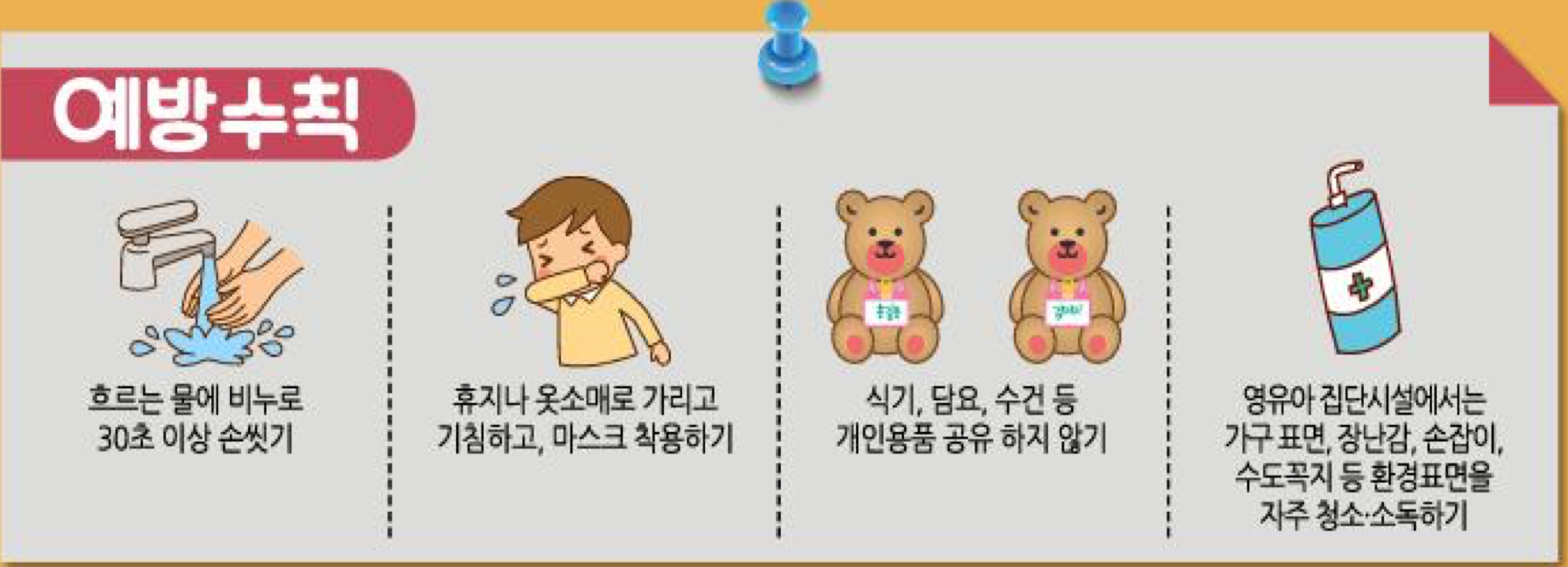 - 개인 물품 구분: 컵, 수건, 식기 등 공동 사용 금지