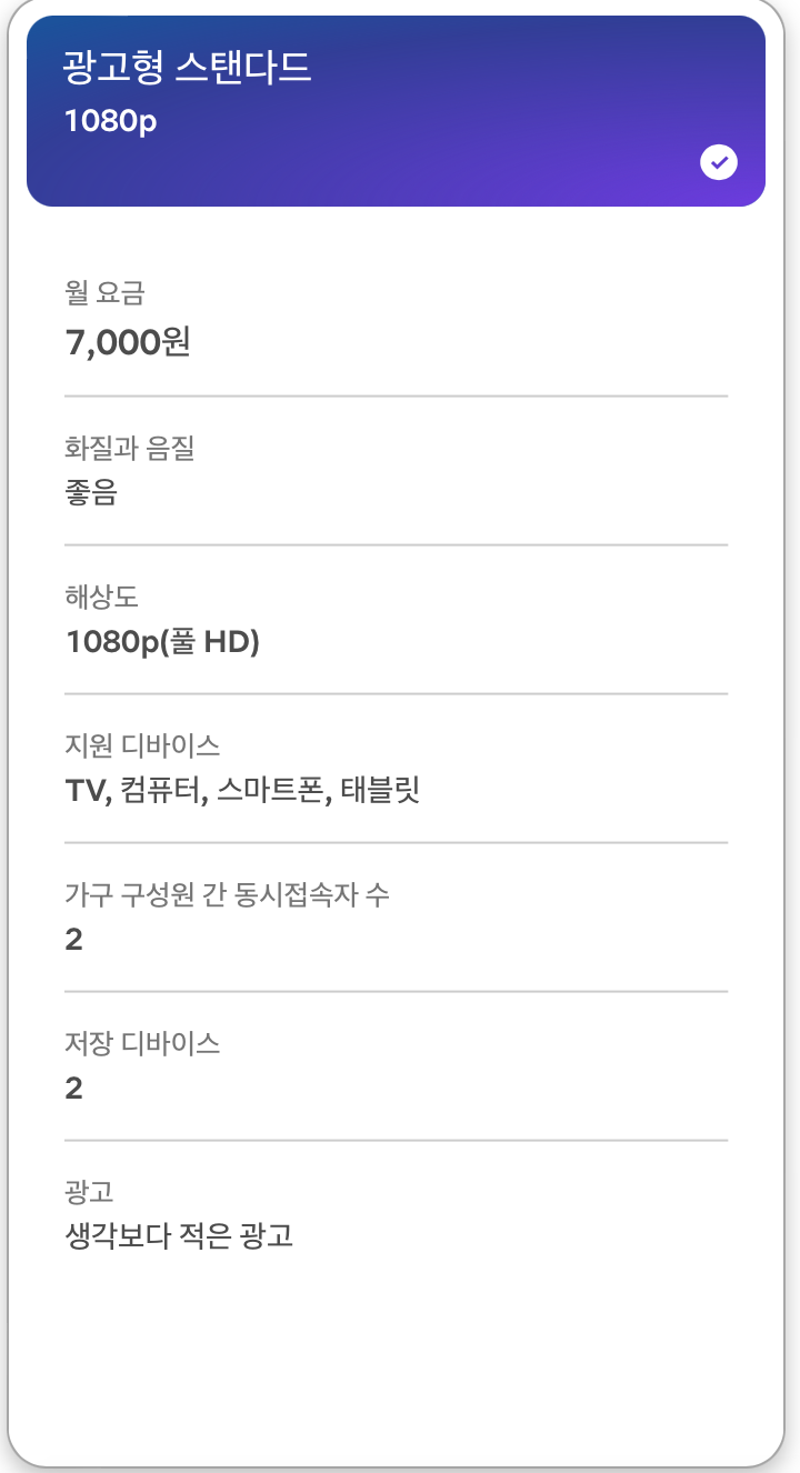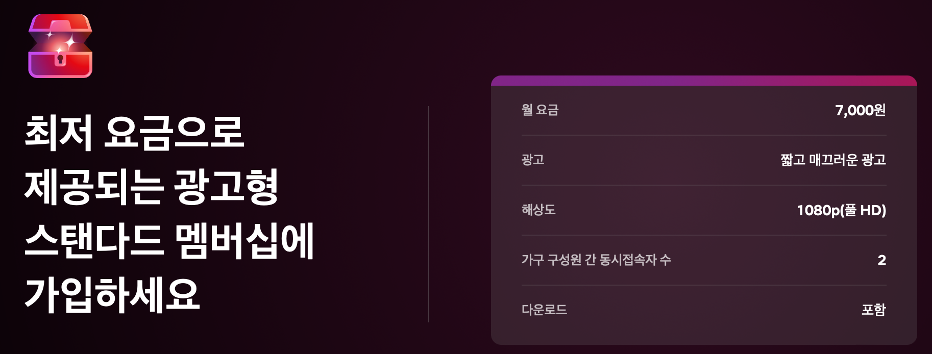 | 광고형 스탠다드 | 7,000원 | Full HD | 2명 | O | 2대 | 광고 삽입, 일부 콘텐츠 제한 |