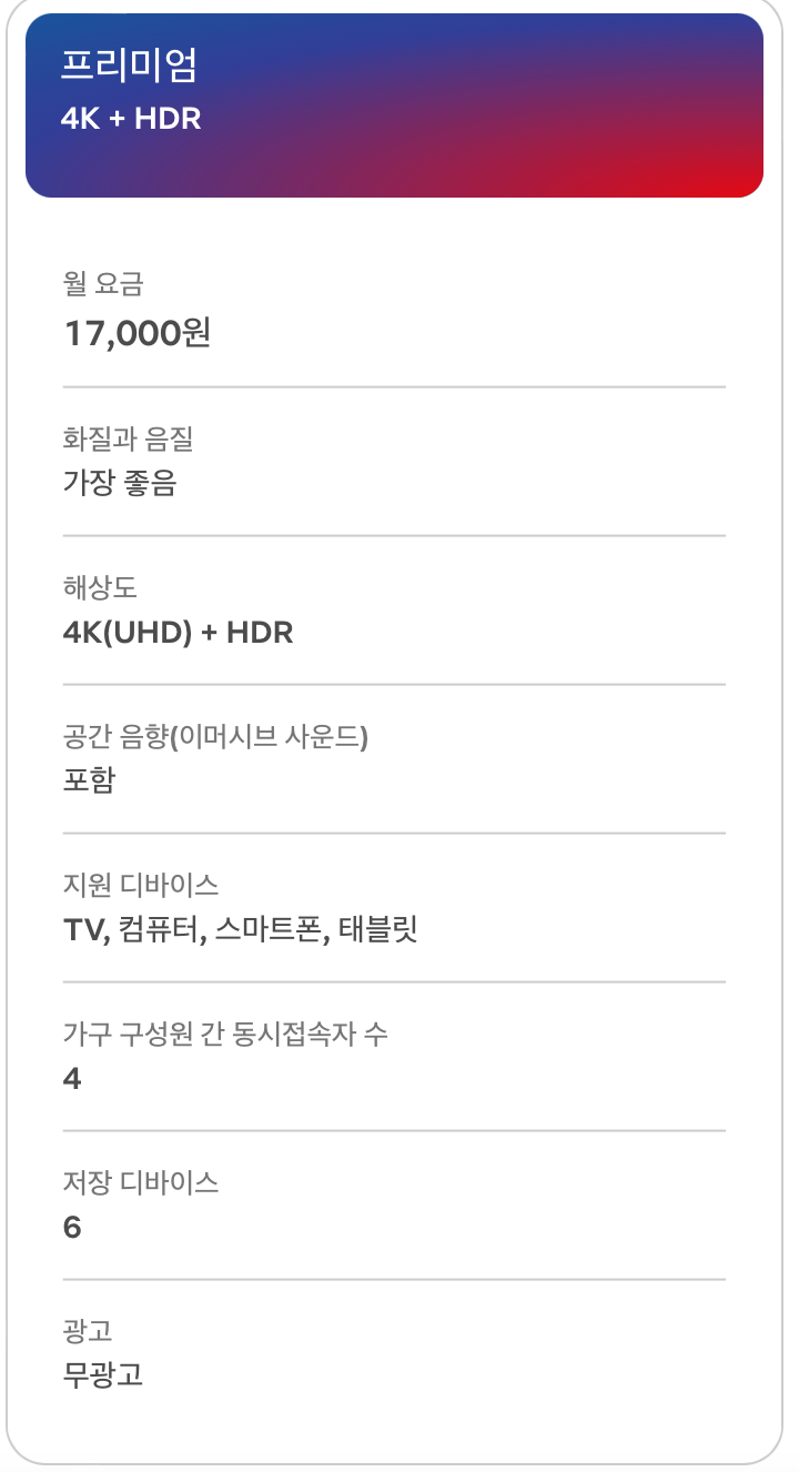 | 프리미엄 | 17,000원 | UHD | 4명 | X | 6대 | 고화질, 다인 시청 최적 |
