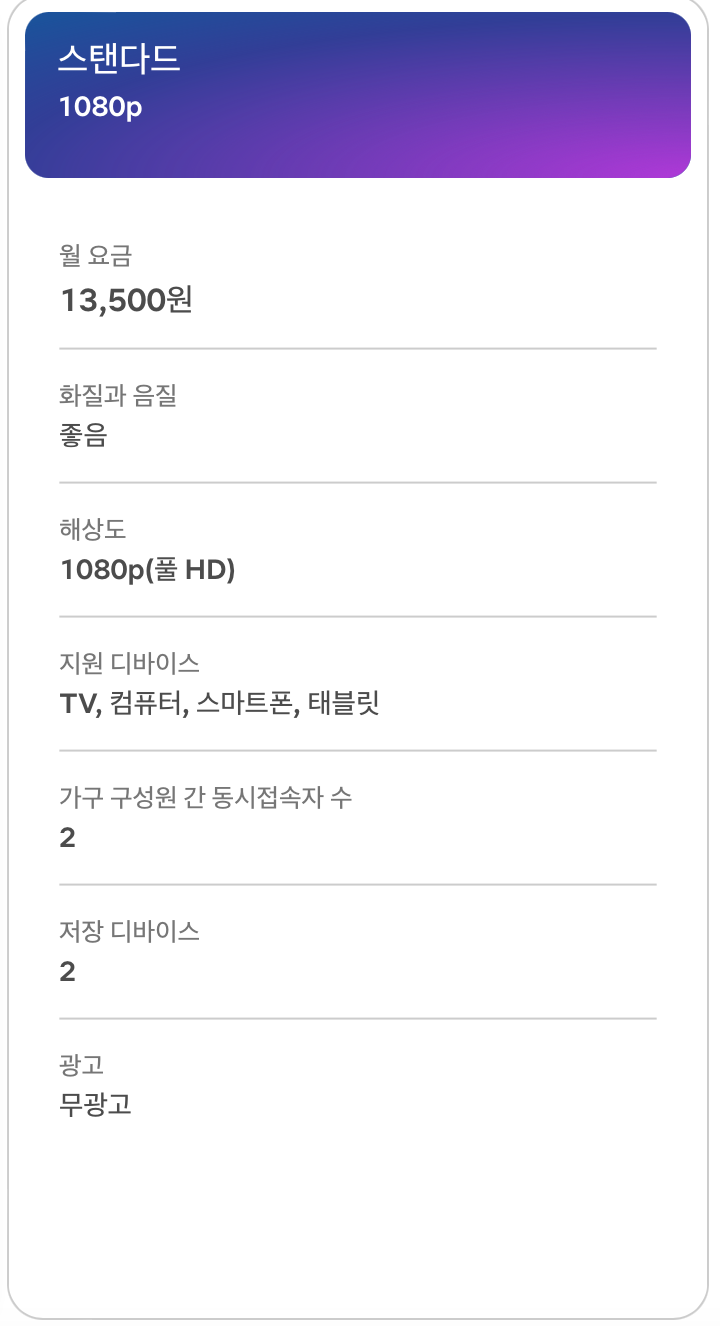 | 스탠다드 | 13,500원 | Full HD | 2명 | X | 2대 | 광고 없음, 가구 외 1인 추가 가능 |