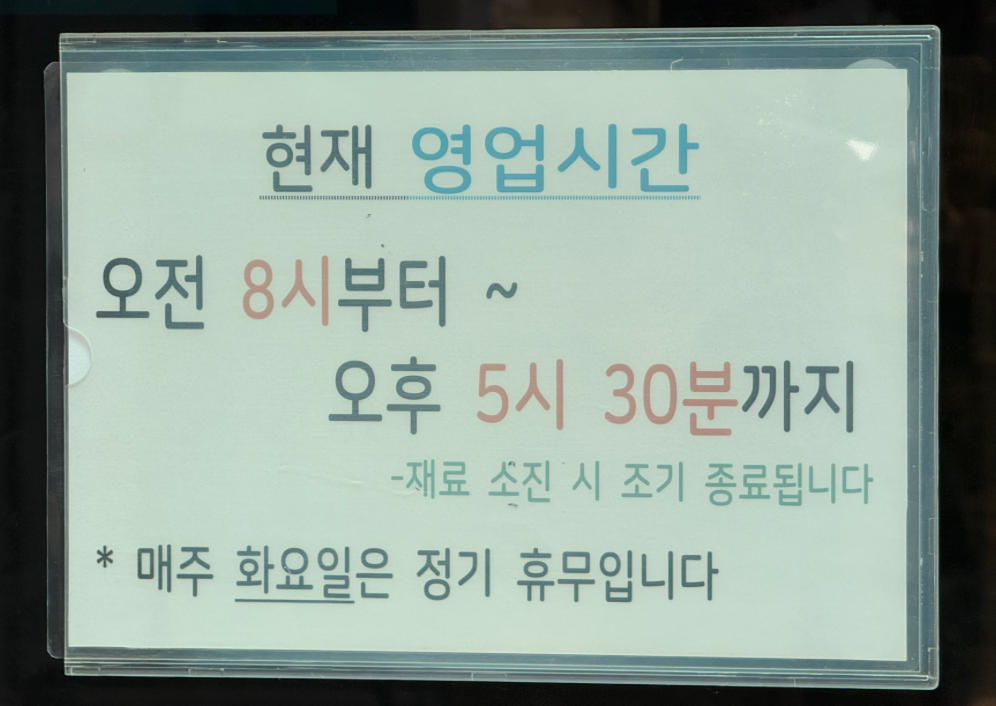 - 기본: 월, 수~일 08:00–17:30, 라스트오더 17:00 (화요일 휴무)