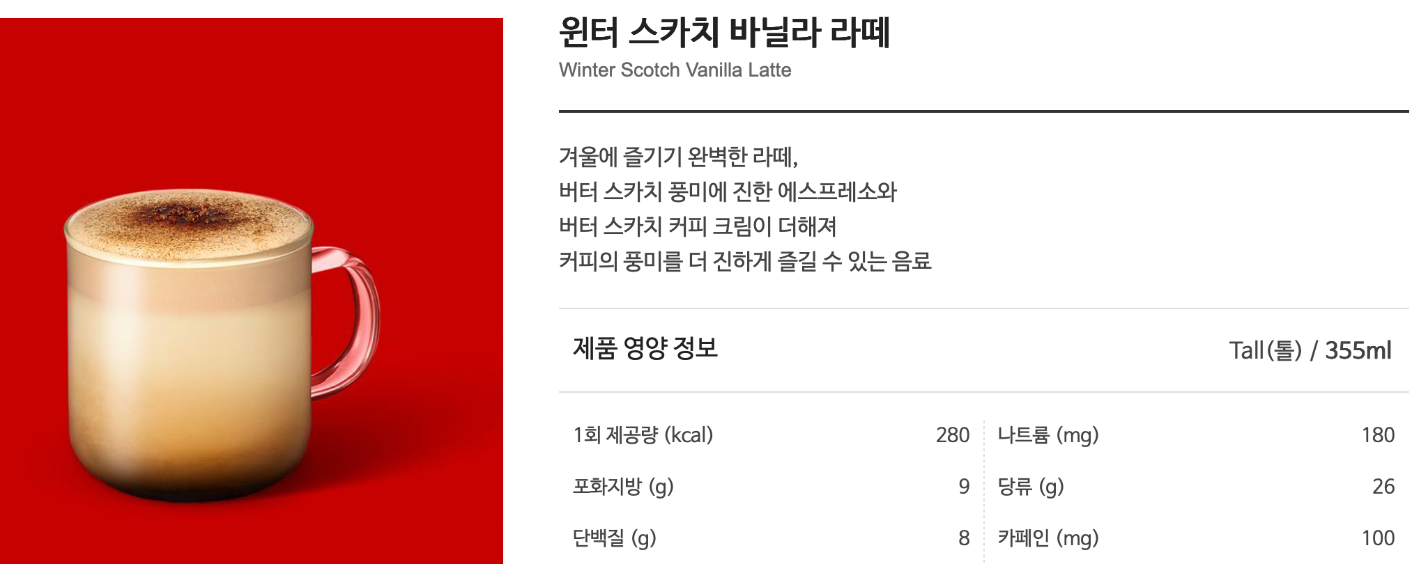 이 음료는 말 그대로 ‘겨울(Winter)’의 따뜻한 감성 + ‘스카치 바닐라(Butterscotch Vanilla)’ 풍미라는 두 가지 키워드를 조합하여 소비자에게 “한정감 있는 고급 라떼”로 다가가고 있습니다. 특히 바닐라 라떼의 부드러움 위에 버터 스카치의 달콤하면서도 깊은 풍미를 더해 기존 라떼 메뉴와는 차별화를 꾀한 점이 특징입니다.