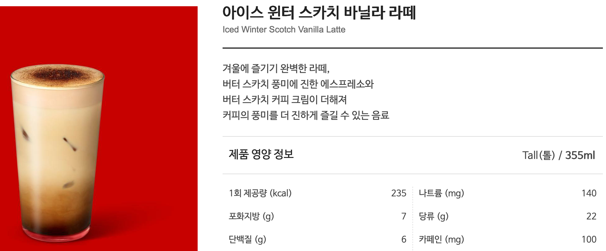 - 윈터스카치바닐라라떼 모델의 경우 톨 사이즈 기준 235 kcal 입니다.