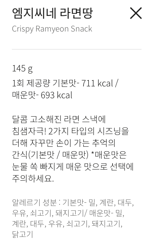 - 구성: 컵 용기 안에 라면땅 + 시즈닝 파우더