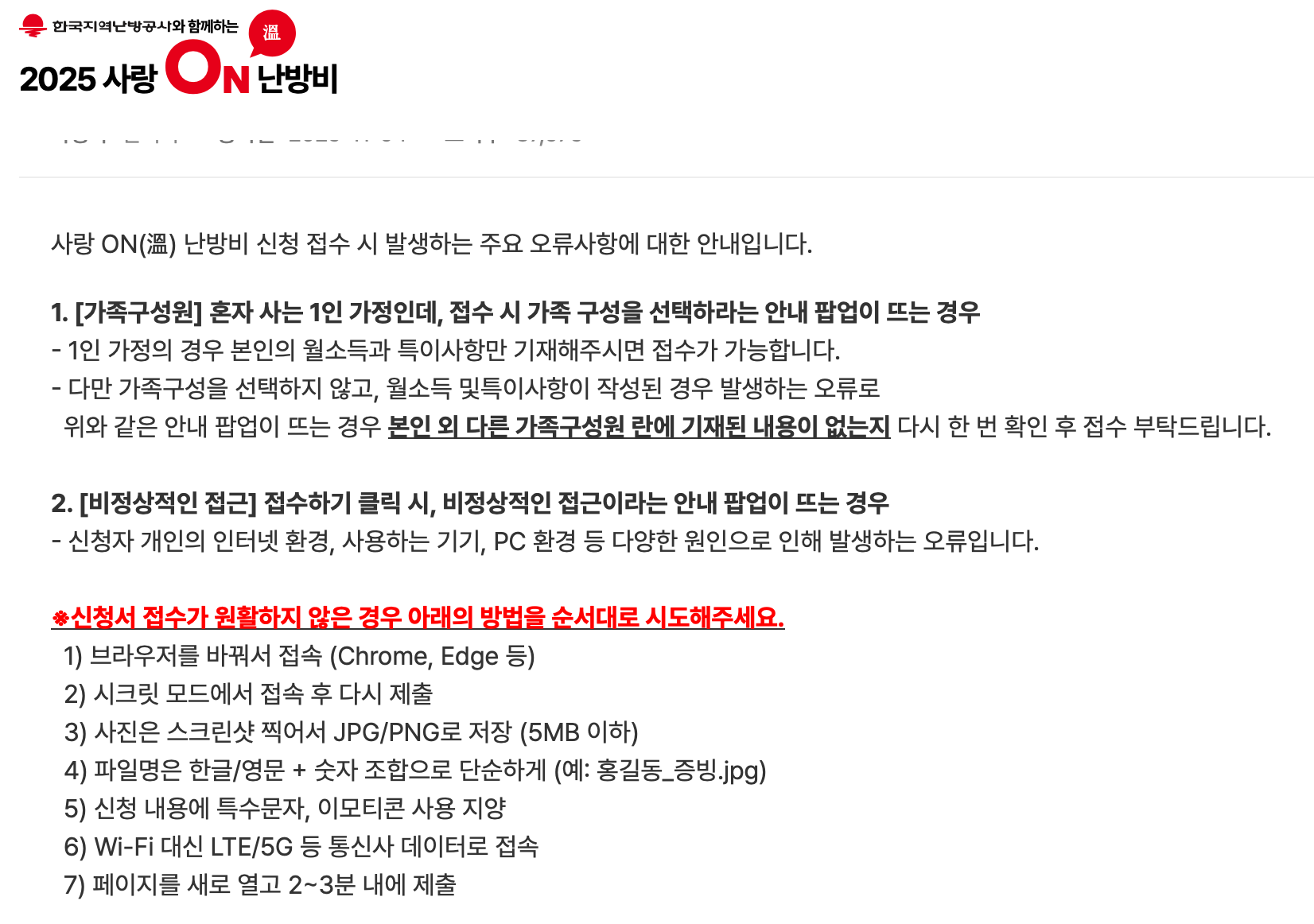 - 중복 수혜 불가 (예: 에너지바우처, 지자체 난방비 지원 중복 X)